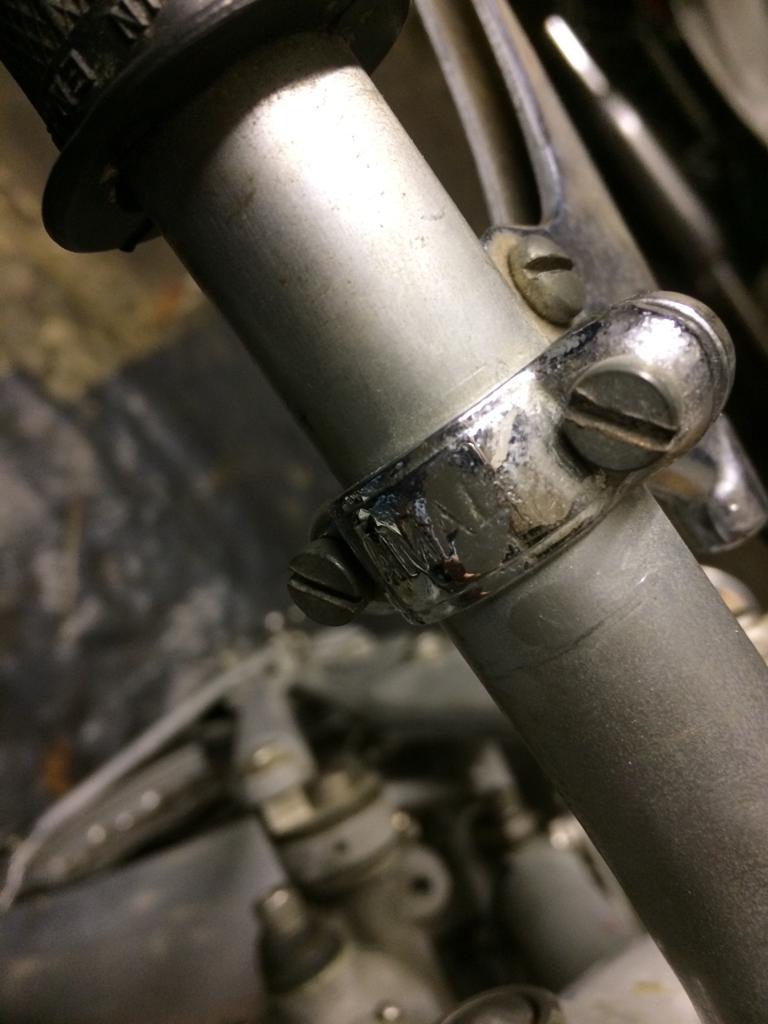 Detail of the current set up minus the magneto and carburettor control levers. Handlebar, handlebar clamps and studs plainly visible.