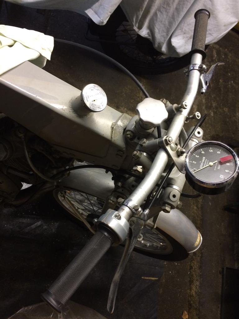 1. We were obliged to use ball ended levers, even in the 80s, for safety reasons , at least they’re Brit… no choke parts with carb, or a stumpy lever to operate, but not really needed to race in Oz. It was delivered with an advance /retard lever for the magneto, to its new Japanese owner , now missing, and equipped with standard flat bars, also replaced. Alloy throttle grip chosen for its quick take up at the start line, effective, but not original.