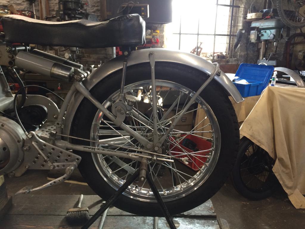 The correct size 20″ x 2.1/2″ Borrani rear rim (supplied by John Hanson) has been laced to the hub and fitted to the rear fork. The rim was not as good a condition as hoped and the wheel builder had a bit of a job tweaking it to run true.