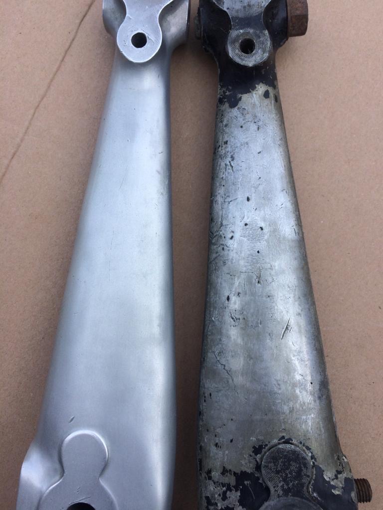 As mentioned in a previous post, the Girdraulic fork legs, which are original to the bike, were anodised. This Grey Flash, the third production bike, was a new model for Vincent and they were trying to impress the market. To this end, the bike left The Works with eye-grabbing finishes – later Grey Flashes were simply painted grey. The dull chromium plate has been easy to spot, once the paint was stripped off the parts. However, whether alloy parts still showed signs of anodising has proven frustratingly difficult to ascertain. You see, the anodised finish was silver in colour which looks very similar to bare aluminium, especially on castings. The forks looked incredible, once they’d been stripped of their paint, and we knew, without a shadow of a doubt, that (i) they were original to the bike and (ii) they would have been anodised. They would be the perfect reference point for comparing other parts to, to see whether those parts were anodised or not. Then I remembered that I had an original, untouched Girdraulic fork leg stashed away at home. So, I arranged to have it dug out and my mum sent it to Bert. Once it had arrived, he stripped off the stove enameling and laid it next to one of 2751’s legs.