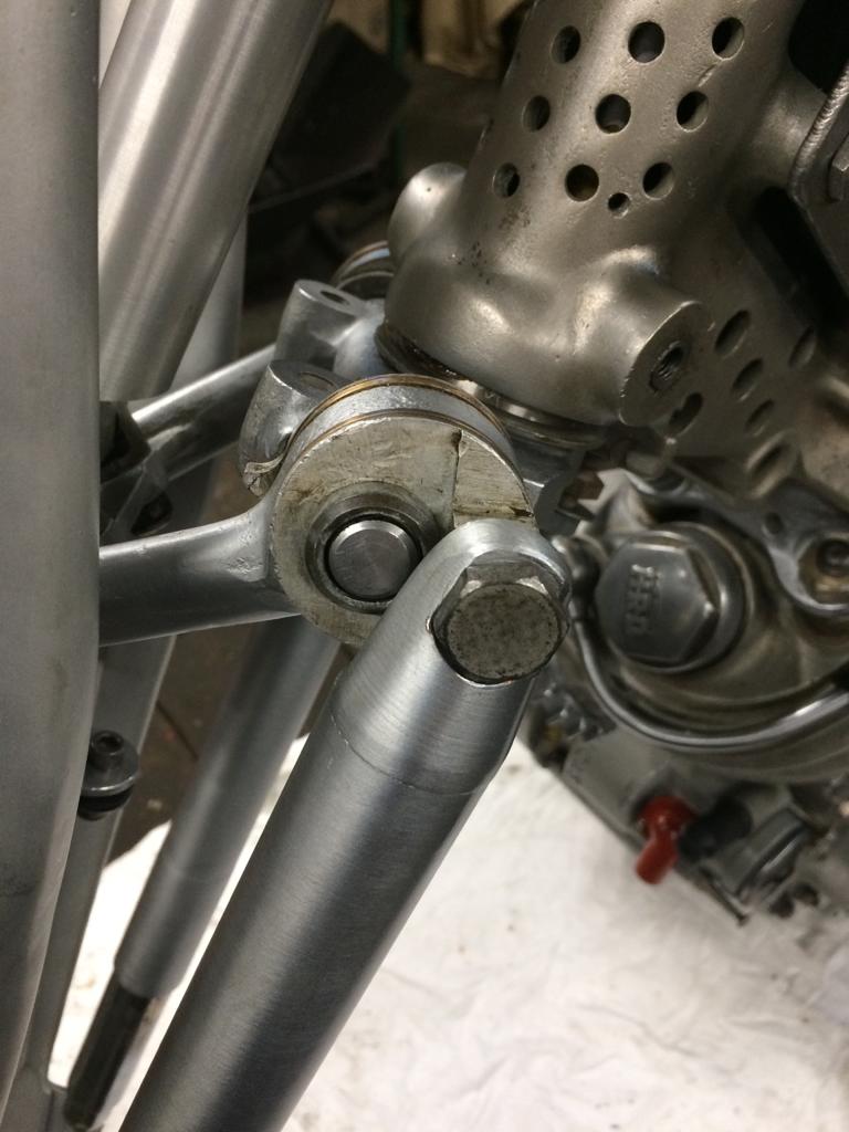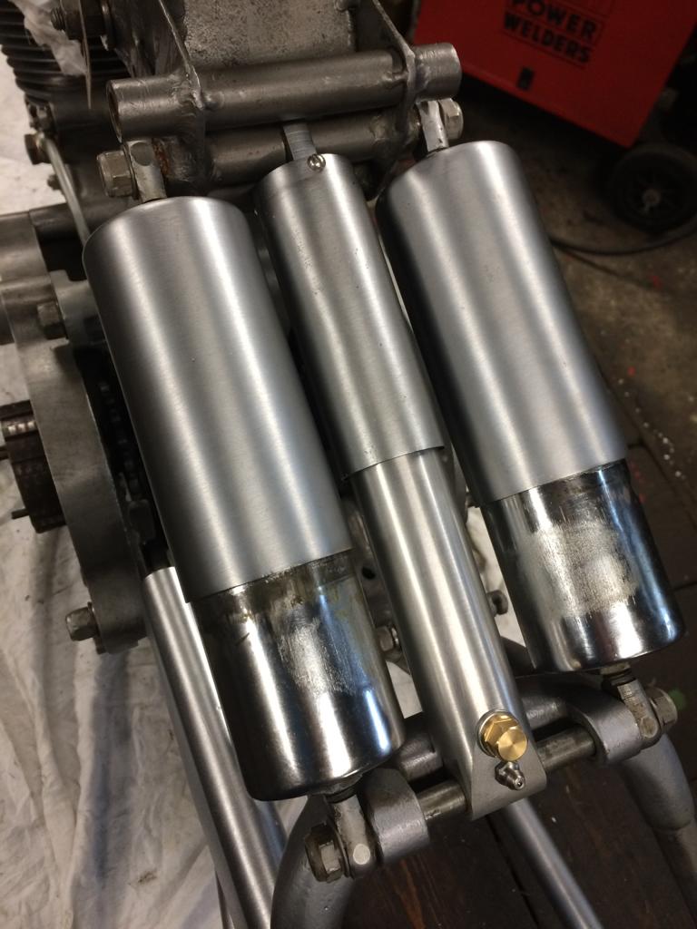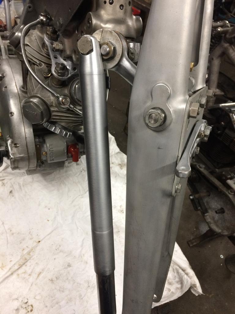 This is looking spectacular! The different chromium plated finishes complimenting the machined alloy of the damper and the cad plated fasteners. The finish of the brass reservoir drain plug needs to be dulled down a bit. The modern grease nipple also stands out… Bert managed to find period nipples to replace modern ones located on other parts of the bike. If we’re successful in finding some more then it can be replaced later on.