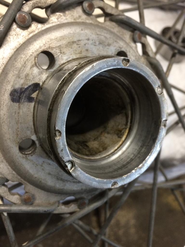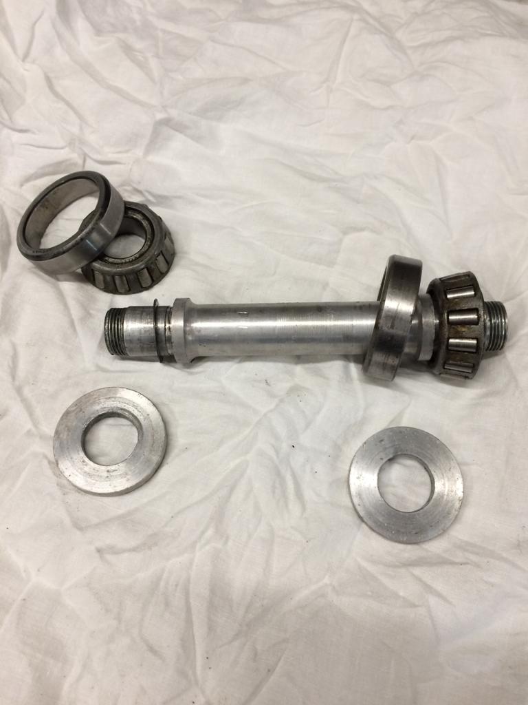 What to do? Replacing the hub with a new pattern item and fitting standard bearings was one option. Another was finding a period hub and hollow axle and fitting that. The former of these options is the least desirable as we would be replacing period items with new ones. The latter option seemed more in keeping with the level of authenticity we are are trying to achieve but we have decided to go with what we already have. The reason for this is that (i) it’s a genuine period hub (albeit of a little bit later vintage than what would have been fitted to the bike when new) and (ii) was used during the bike’s racing career. In addition, it features a hollow axle machined out of lightweight alloy. These were sometimes fitted to Vincents though we’re not sure whether this one is original or made at a later date. Anyway, it seems entirely appropriate to preserve this lightweight component on a racing machine.