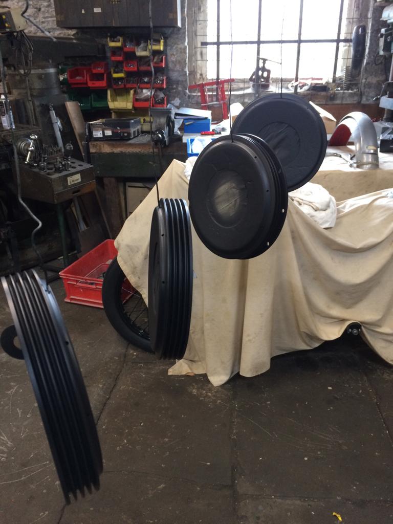 A moment of assembly this early in the process of restoration is a cause for some elation. The rear rim was exchanged for the correct 20″ item early on in the project and now the refurbished drums have been bolted to the hubs and offered up to the forks and RFM.