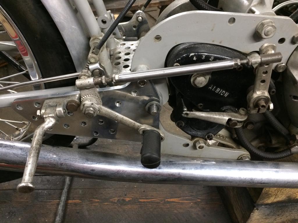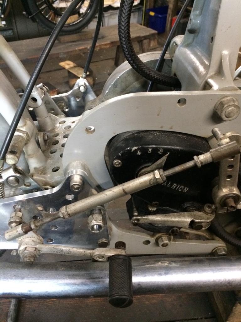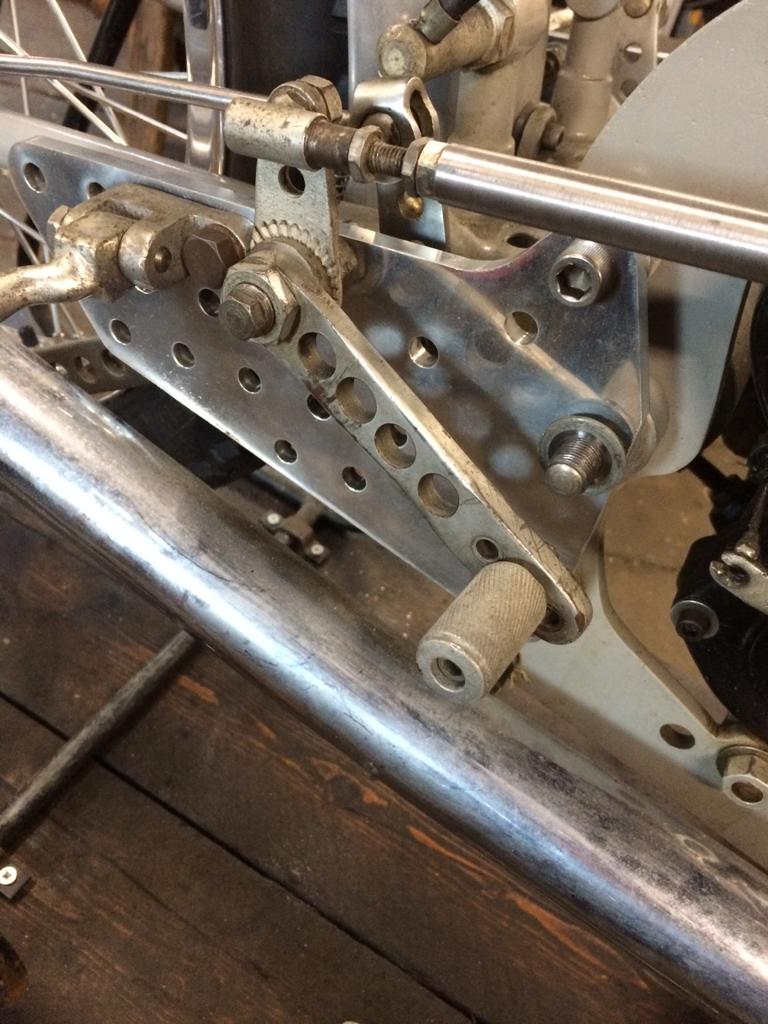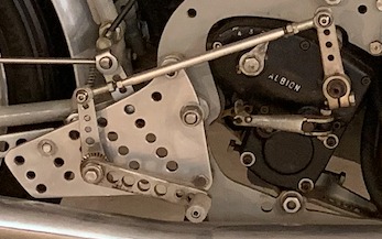 This shot shows the linkage assembled from what we had including a Black Lightning gear change lever. Position of the lever pivot on the hanger plate is incorrect.