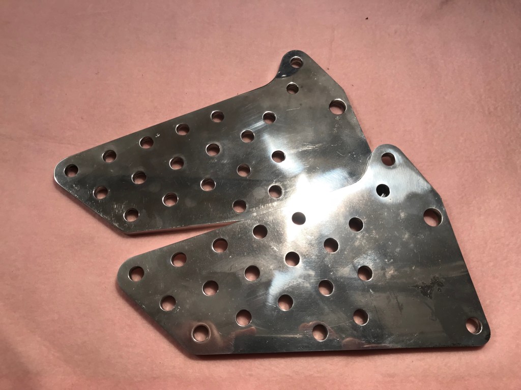 Both footrest control hanger plates were incorrect and fabricated by Peter Johnson. Some time back I had acquired a set manufactured to the correct dimensions and drilled as per original.