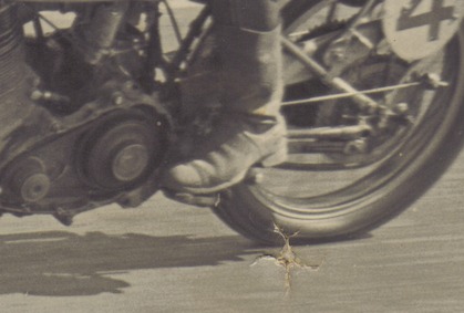A close up of 2751 being raced in period. The pillion footrest/rubber and reversed pedal pad are clearly visible.